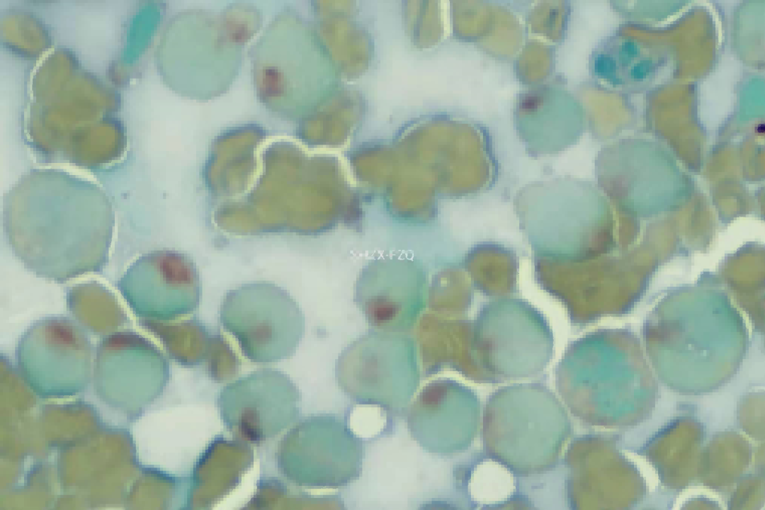可见大量异常细胞,比例及形态描述详见后面的骨髓报告,一个突出的特点是原始细胞有核周淡染区。毫无疑问,该患者的白血病复发了。